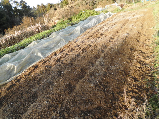 畑に苦土石灰をまいて、耕運機をかけました。 冬に畑を耕してやると寒さで虫や虫の卵が死ぬと思います。