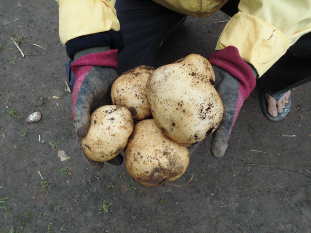 秋ジャガイモを掘りはじめました。なぜか、バカかでかいジャガイモができました。今年のジャガイモは大きい。猛暑だったからかな!