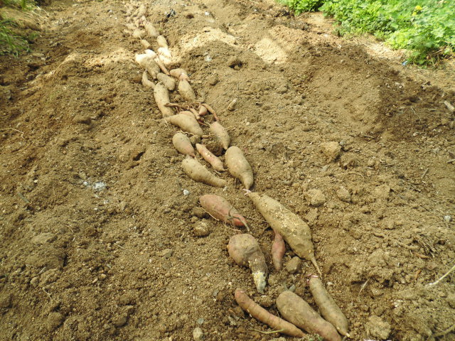 さつまいものつるをつくるための準備をしました。 みぞを掘り、鶏糞と牛墳をしきました。 その上に種芋をふせました。種類は紫芋とべにはるか(甘太...