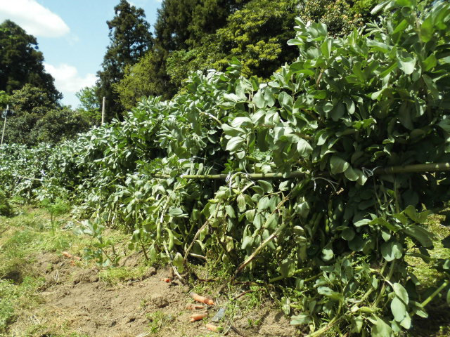 そら豆が大きくなって倒れそうになっています。 竹で支えました。