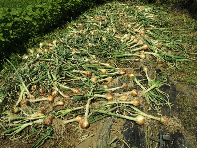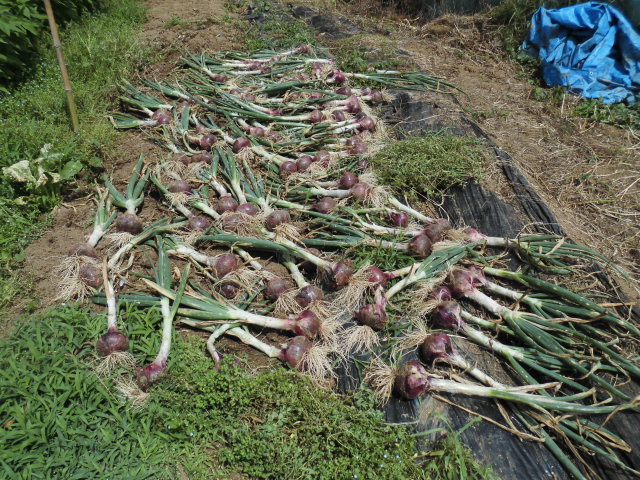 晴れの天気が続くようなので玉ねぎの一部を収穫しました。 茎が少し折れかけたのが収穫の時期です。 一時干して、茎が乾いてから陰につるします。 ...