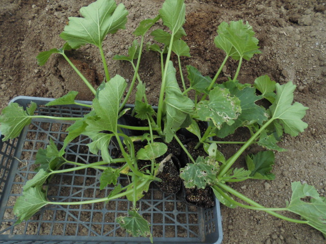 ズッキーニの苗が大きくなりました。 穴を掘り、鶏糞、牛糞を元肥に入れて床を高くして苗を植えました。