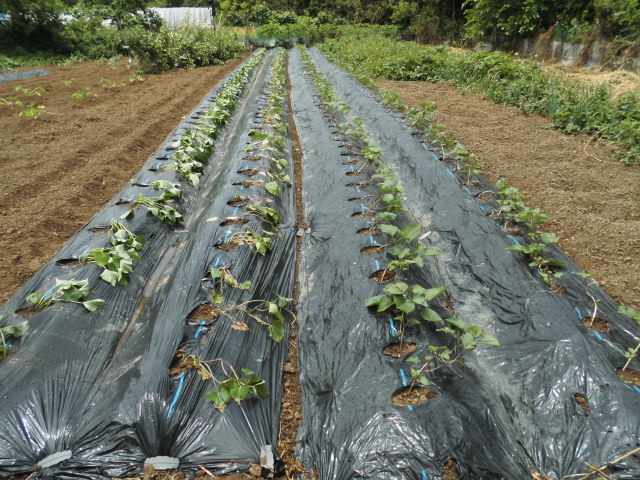 小雨になったので、さつまいものを植えました。 二列は紅あづま、三列目は紫いも、そして四列目は紅はるかです。 苗の成長を見て、もう少し植えます...