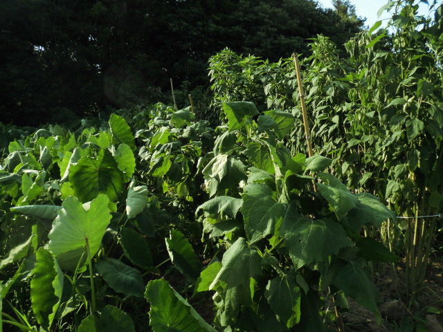 雨と風によってヤーコンが倒れていいました。 竹で支柱をつくり、支えてやりました。