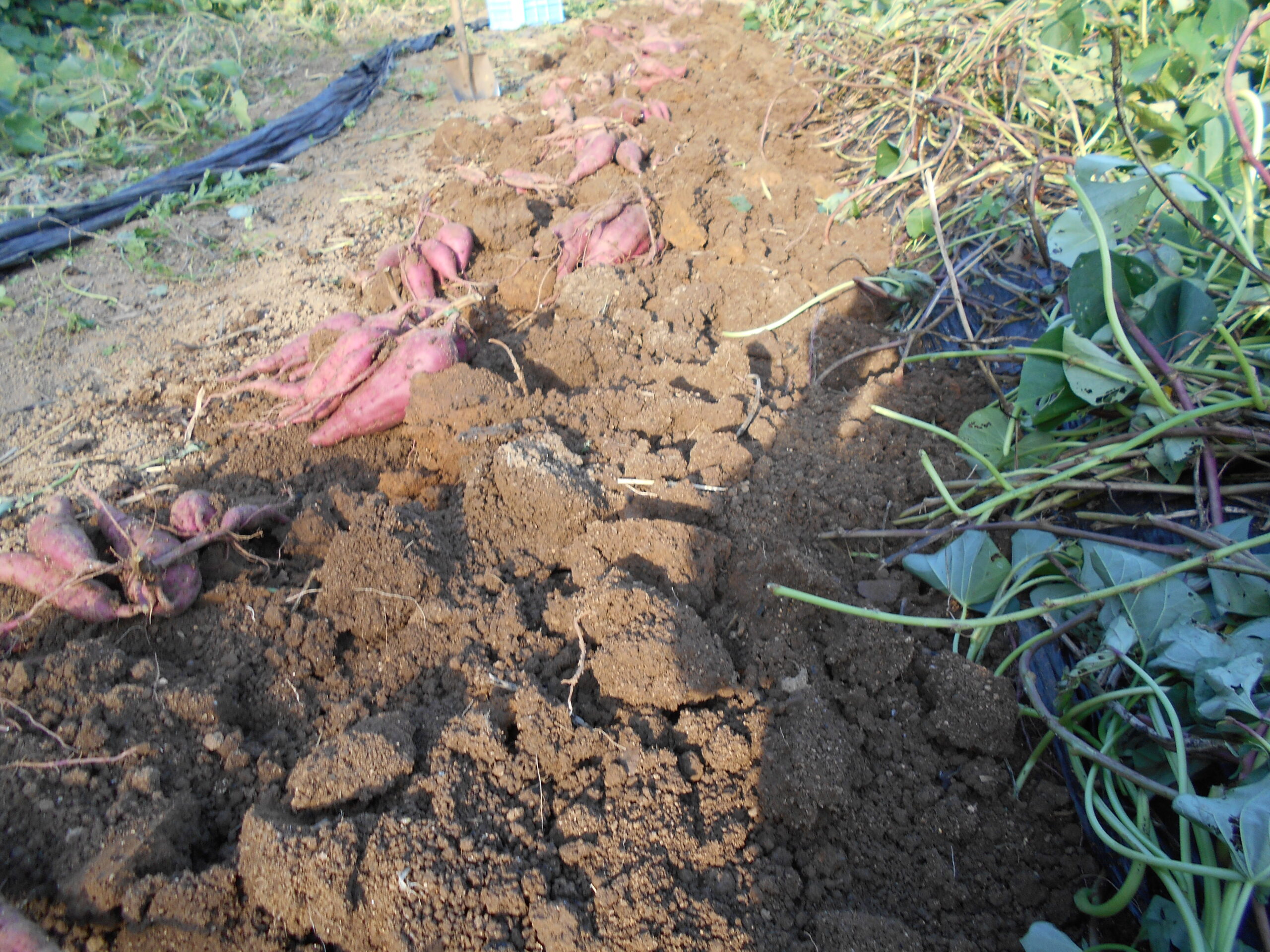 さつまいもをほっています。紅あづまです。 今年は大きな芋がいっていて豊作でしよう。