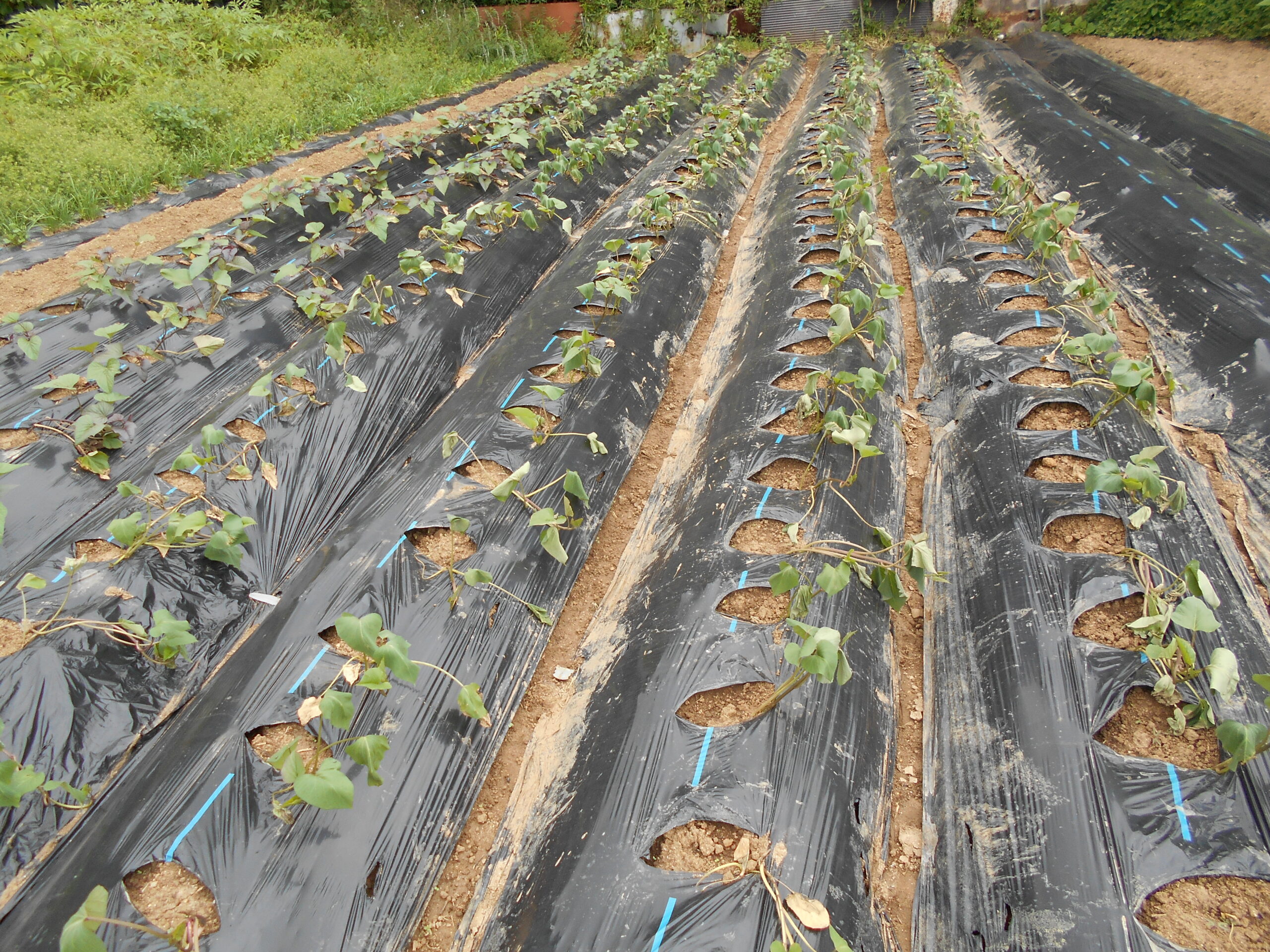 さつまいもの芋づるを植えています。 黒マルチをはって穴をあけ、芋づるを植えています。 次の雨には芋づるが大きくなっているでしよう。