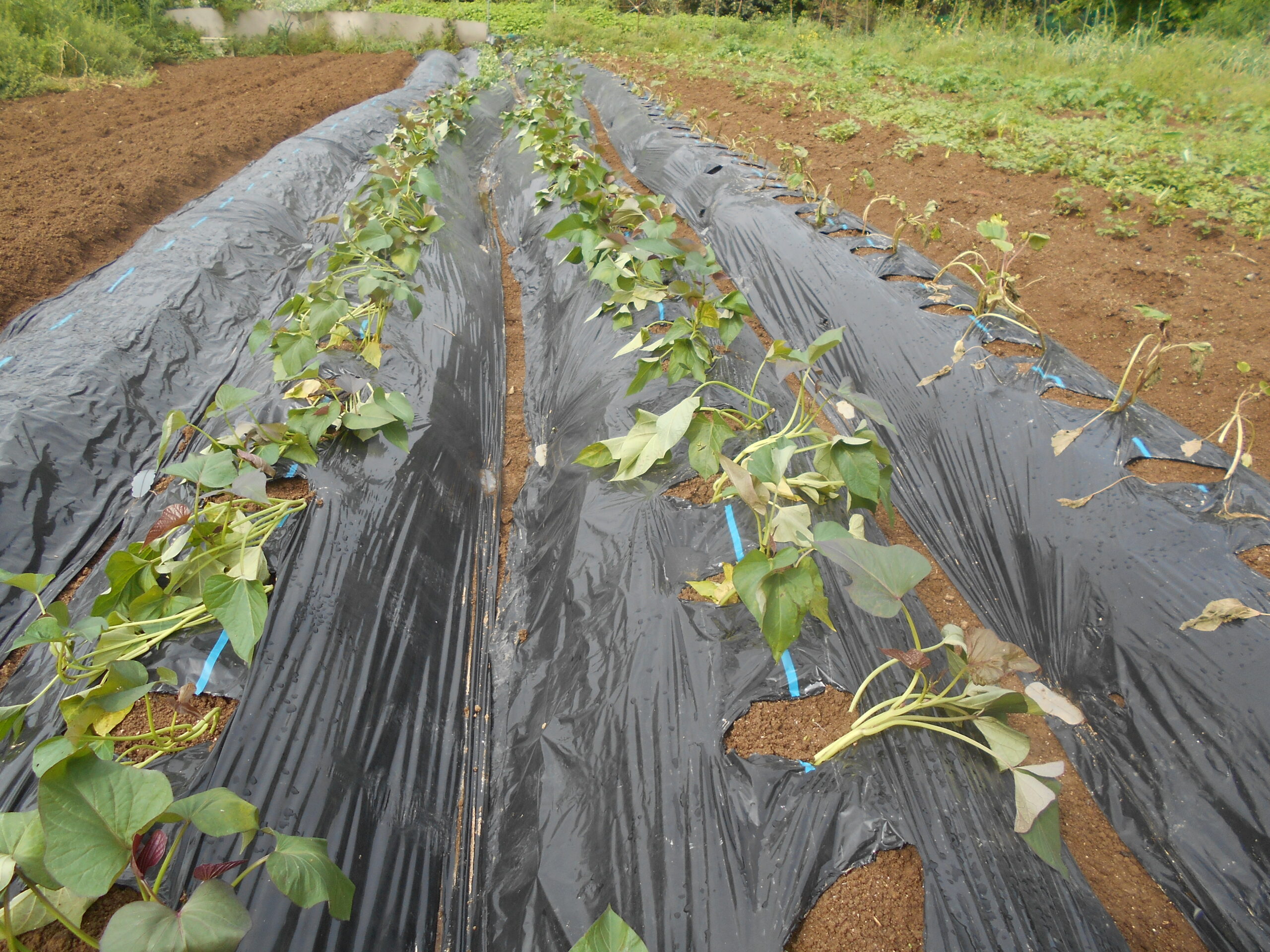 雨の前、さつまいも苗を参列植えました。 さつま芋苗がボツボツ育っています。