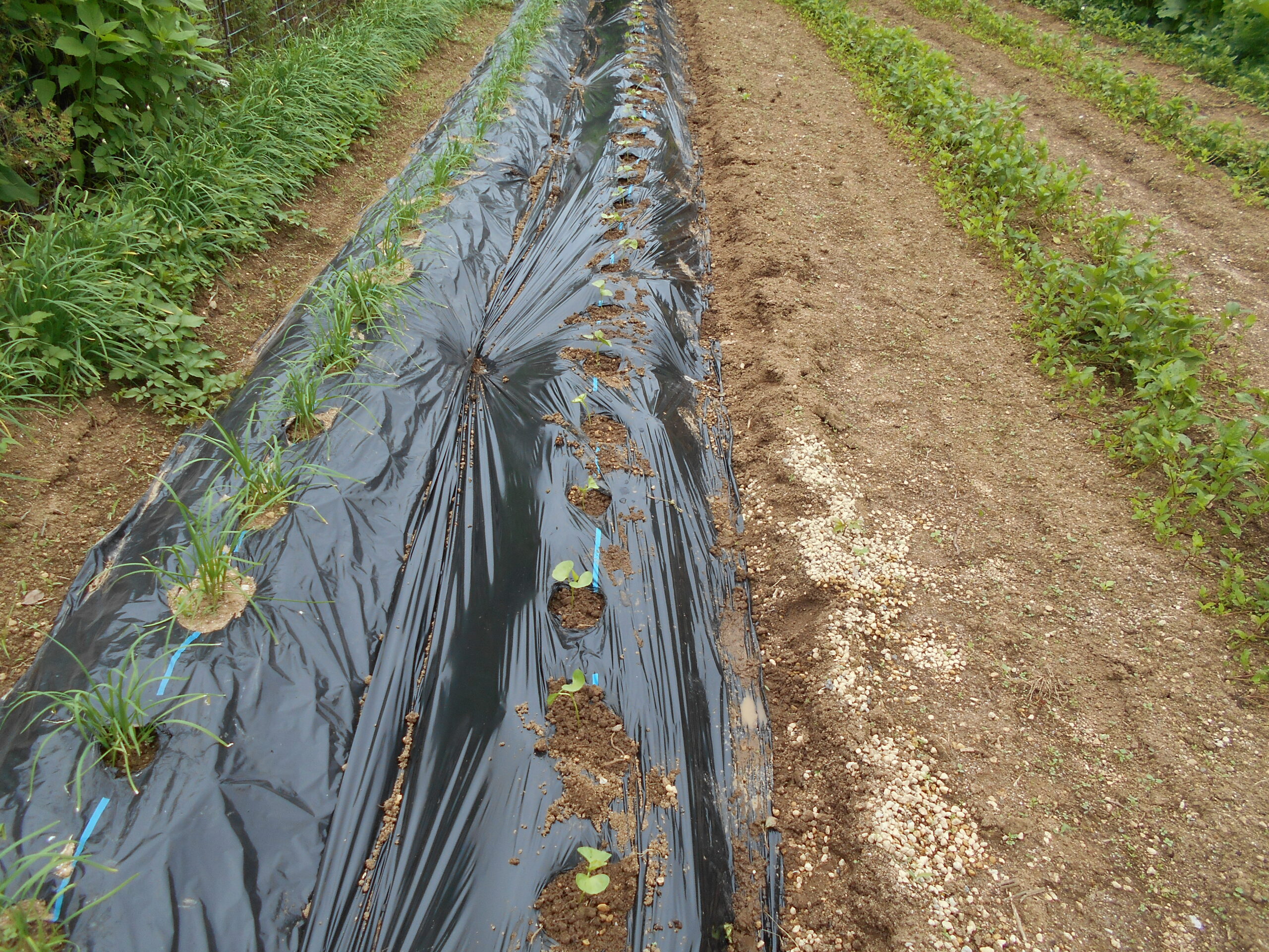 綿の苗が大きくなったので、雨の前に定植しました。 黒マルチを貼って2列植えました。