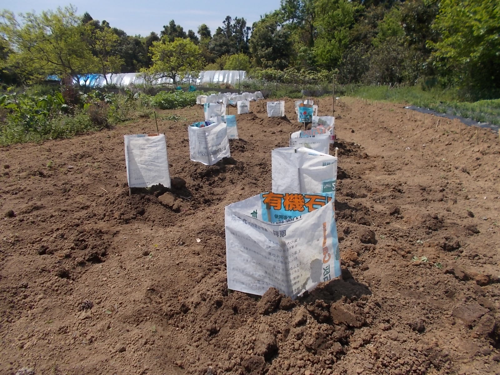 えびすカボチャ、ズッキーニ、スイカの苗を植えました。 基肥として鶏糞、堆肥を入れました。 ビニールをかけて保温しました。
