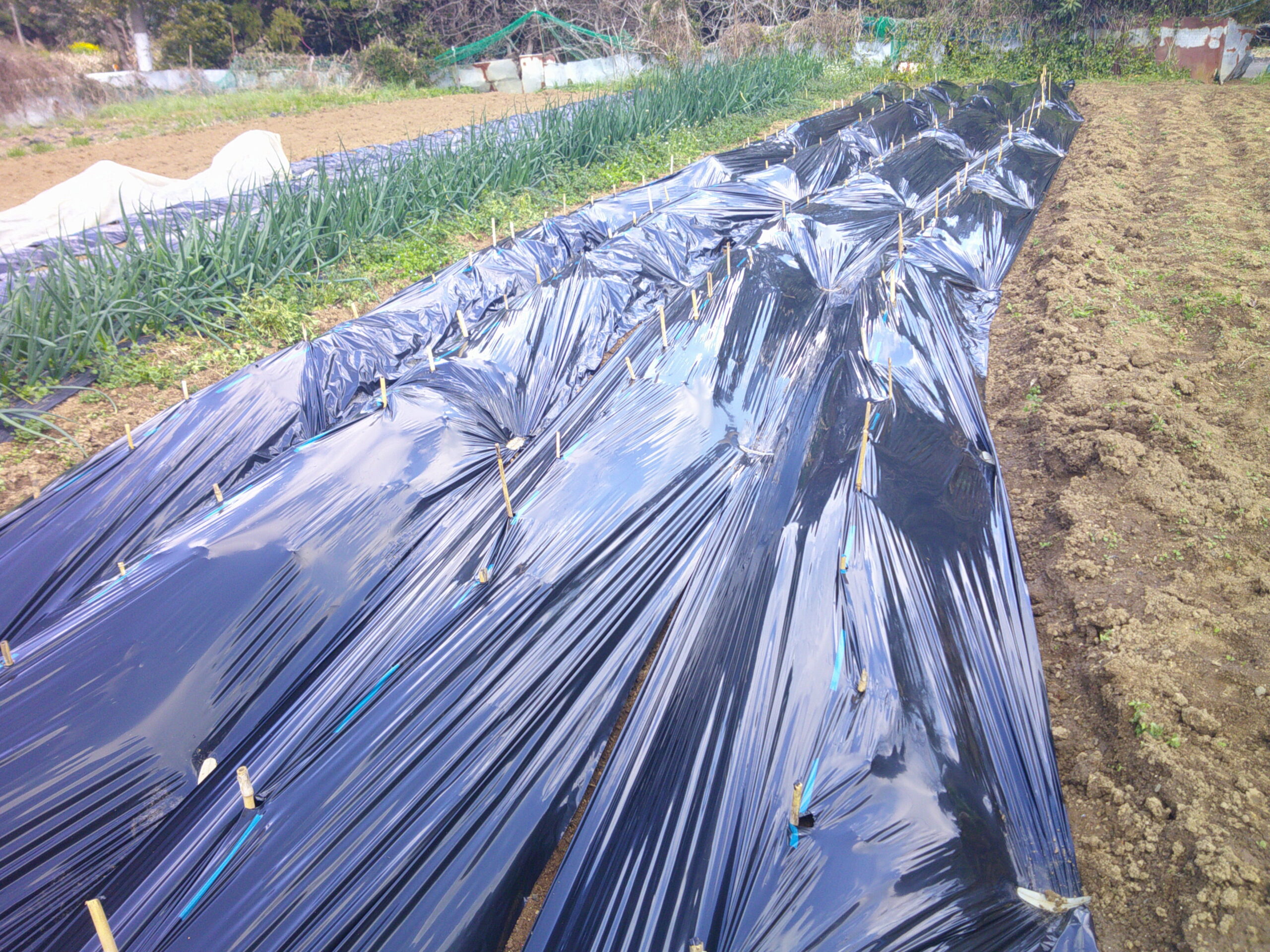 ヤーコン1列と里芋2列を植えおえました。 畝の上に黒マルチをかけました。もう少し寒さが続くようなので、竹で印をつけて穴はしばらく、ほぎません...