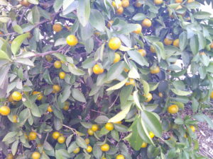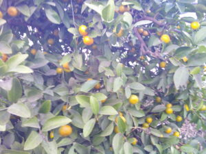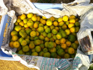 シークワーサーを収穫しています。今年は沢山、実がついています。 摘果等全く手入れをしていないため、実が小さい。