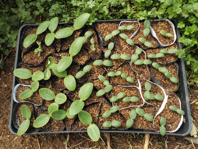 ズッキーニの苗が大きくなりました。 穴を掘り、鶏糞、牛糞を元肥に入れて床を高くして苗を植えました。
