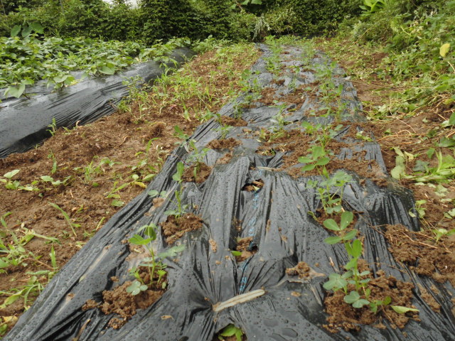 落花生の苗が大きくなったので畑に定植しました。 ある程度育つまで黒マルチをしておきます。
